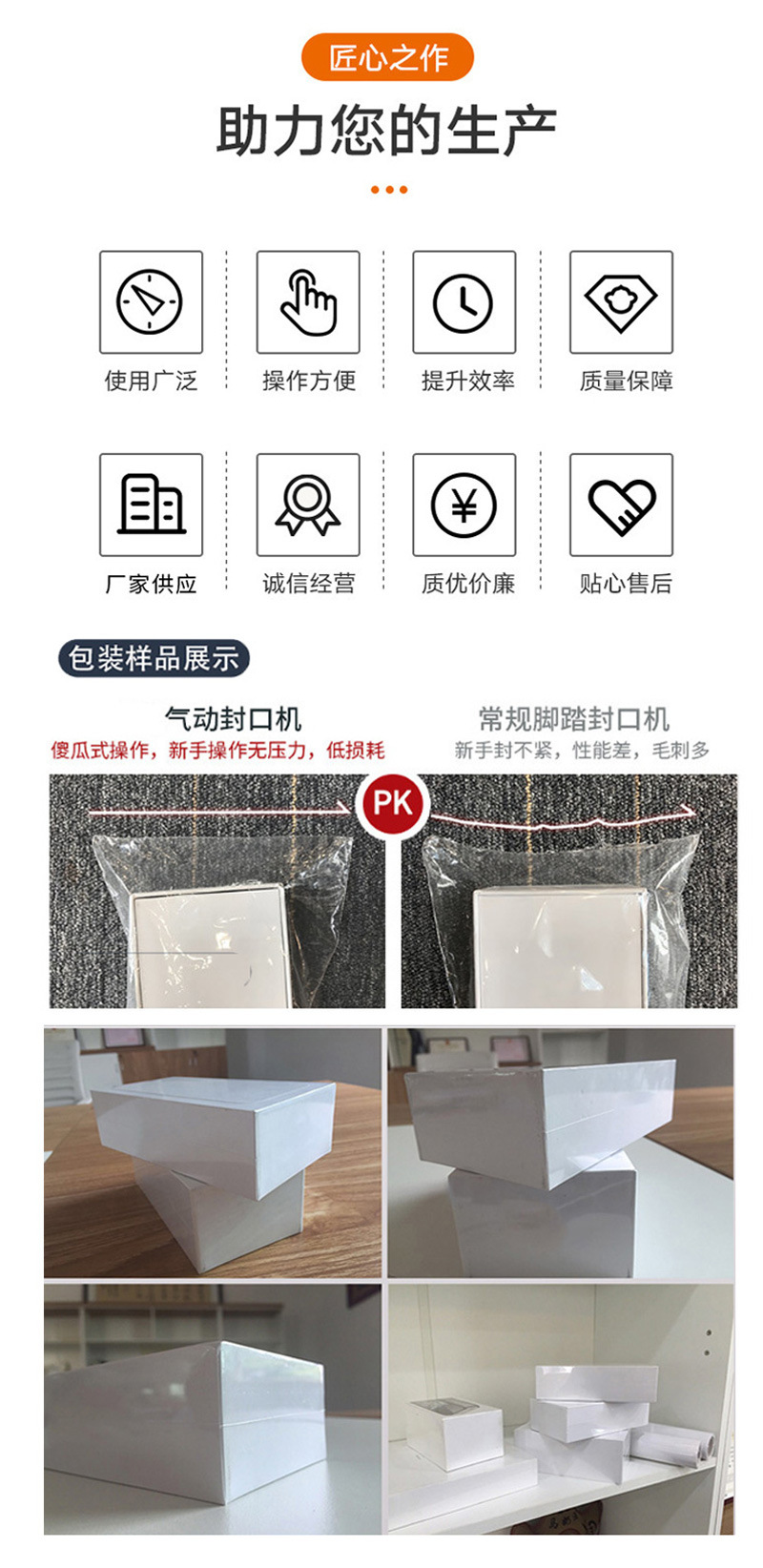 氣動封口機只需點動一下按鈕或踩一下腳踏開關即可工作,大大減輕了操作人員的勞動強度。