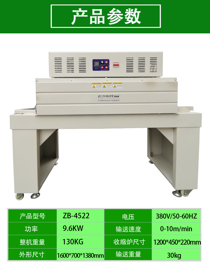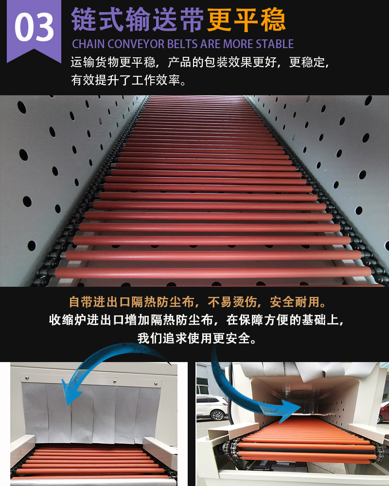 - 輸送帶:負責將待包裝物品平穩地輸送通過各個工作區域,如套膜區、加熱區等。輸送帶的速度通常是可調節的,以便適應不同的包裝速度要求。