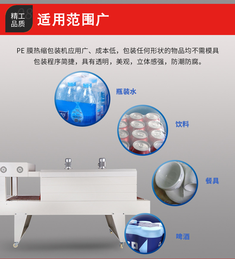 包裝質(zhì)量高:PE 熱收縮包裝機能夠使 PE 薄膜緊密地貼合產(chǎn)品,包裝后的產(chǎn)品外觀整潔、美觀,沒有褶皺。由于 PE 薄膜本身具有良好的柔韌性和透明度,包裝后的產(chǎn)品可以清晰地展示其形狀和外觀,同時也能有效地防止灰塵、水分等進入產(chǎn)品,起到很好的保護作用。