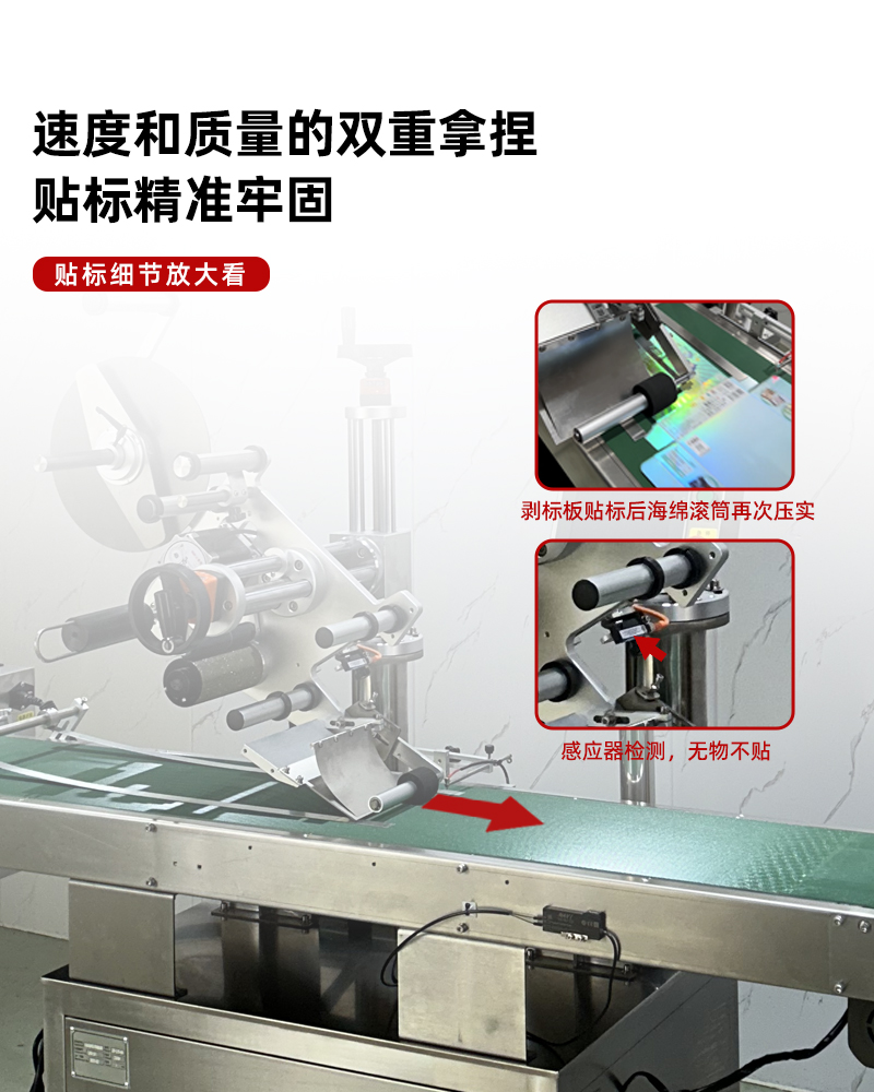 - 標簽輸送帶:負責將剝離后的標簽輸送至貼標位置,與產品輸送帶同步運行,確保標簽與產品在貼標瞬間準確對接。標簽輸送帶同樣具備精確的速度控制和位置校準功能。