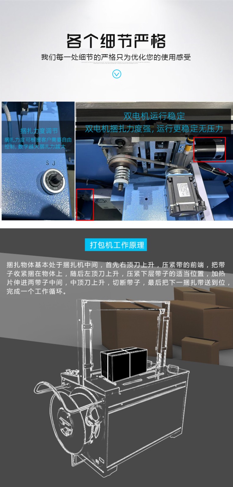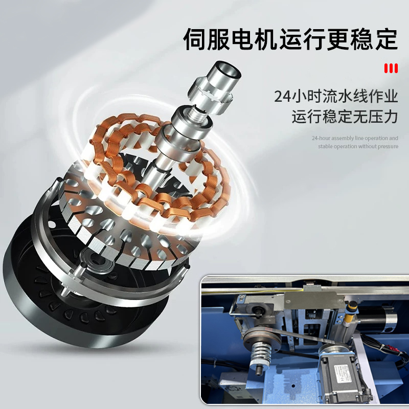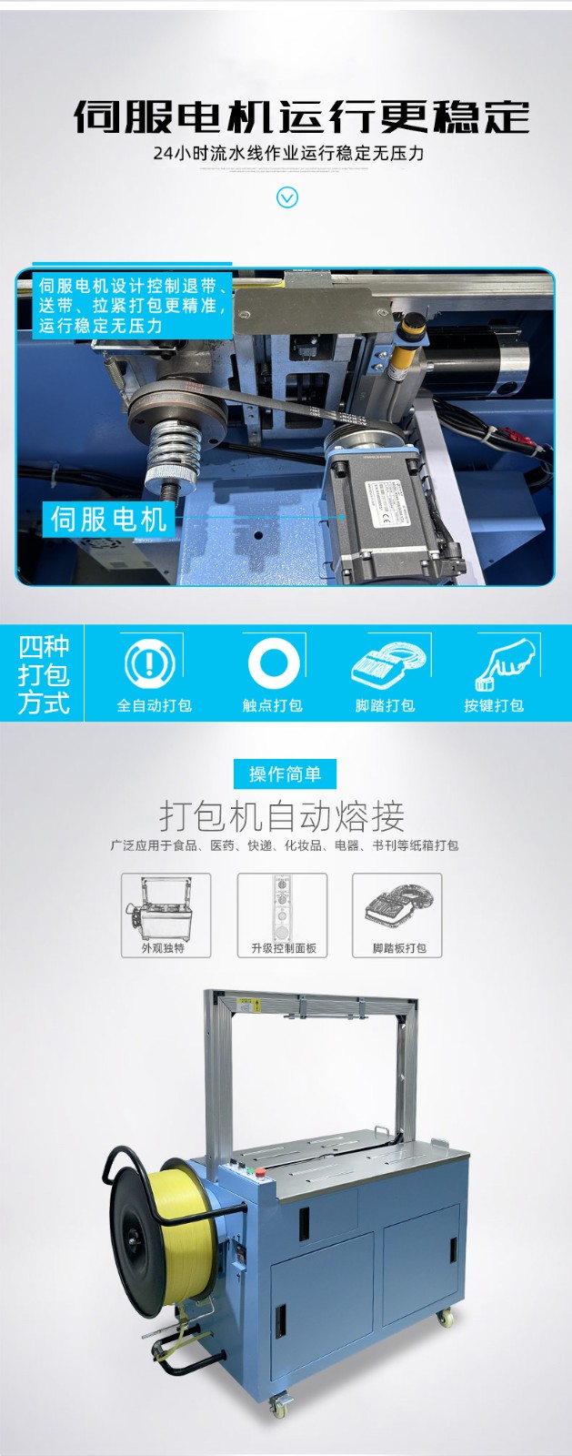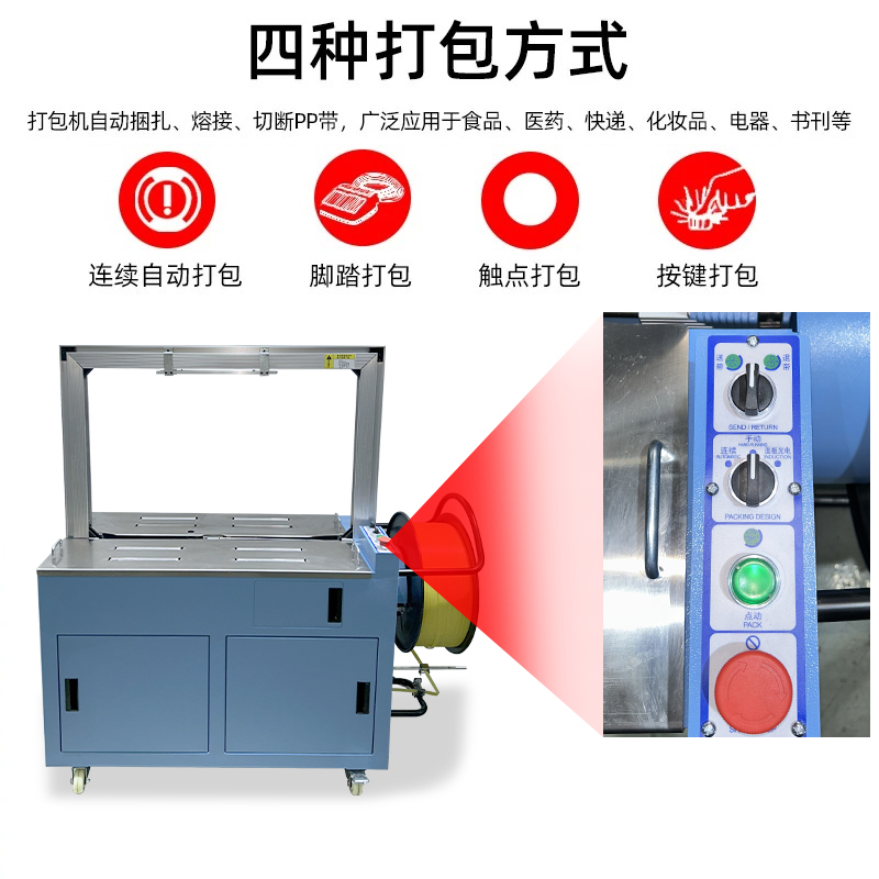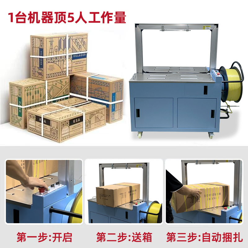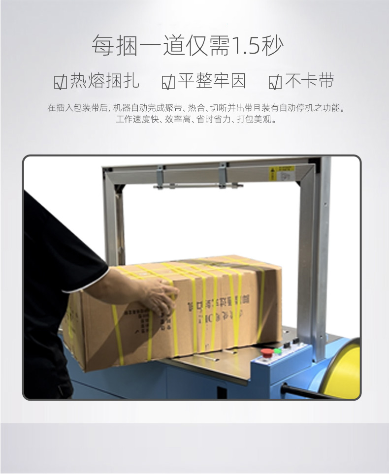 結(jié)構(gòu)組成 伺服電機(jī):作為核心部件,相比傳統(tǒng)電機(jī),它能實(shí)現(xiàn)更高的控制精度和響應(yīng)速度,可在捆扎時(shí)精準(zhǔn)調(diào)整捆扎帶張力,保障捆扎的緊密與均勻。 控制系統(tǒng):負(fù)責(zé)智能化管理整個(gè)捆扎流程。通過傳感器與程序控制,實(shí)時(shí)監(jiān)測(cè)并調(diào)整捆扎速度、張力等參數(shù),用戶還能依不同產(chǎn)品需求設(shè)定相應(yīng)捆扎參數(shù),滿足多樣化包裝需求。 捆扎裝置:一般采用熱合或熱熔方式固定捆扎帶。熱合是通過加熱使捆扎帶兩端熔合,形成牢固的捆扎效果,提高捆扎強(qiáng)度,防止運(yùn)輸過程中松脫。 輸送系統(tǒng):負(fù)責(zé)將待捆扎產(chǎn)品送入捆扎機(jī),常與輸送帶或自動(dòng)化生產(chǎn)線等其他生產(chǎn)設(shè)備聯(lián)動(dòng),形