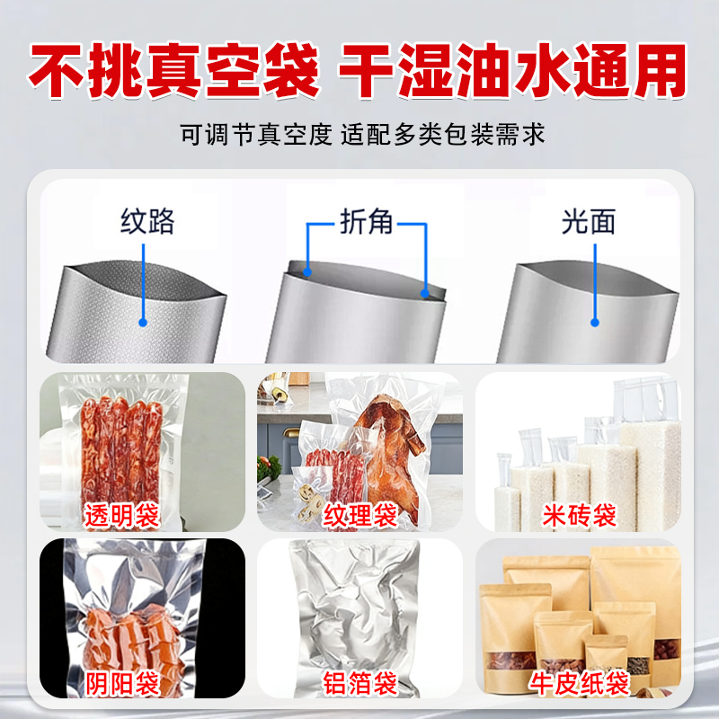操作上搭載微電腦控制系統,一鍵設定真空時間、封口時間,無需專業培訓即可上手,降低人工成本。除了帶液食品,還可兼容堅果、干貨、五金電子元件等固體產品包裝,一機多用適配多品類生產需求。