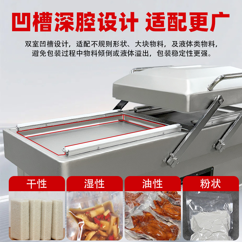 雙室凹槽真空包裝機,專為鹵味、水產、預制菜等帶湯汁、高水分產品量身打造,創新下凹式真空室結構搭配雙室交替工作模式,既解決液體包裝溢漏難題,又大幅提升生產效率,是食品加工、生鮮鎖鮮的得力設備。