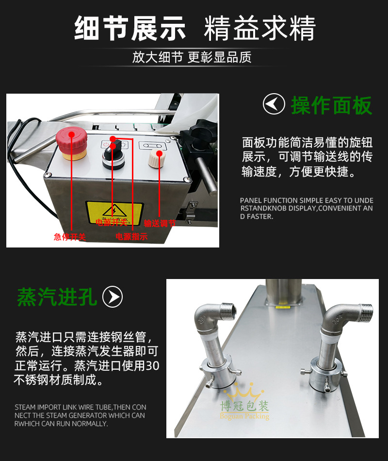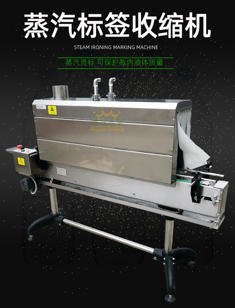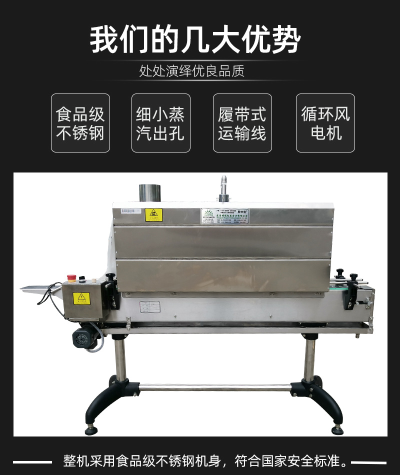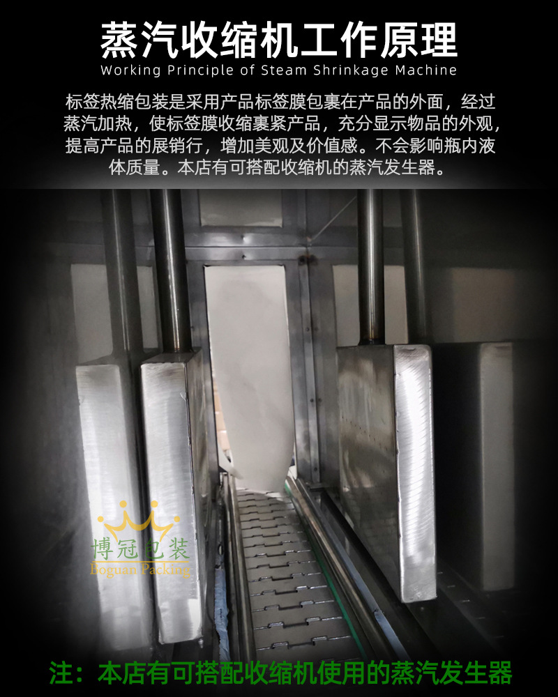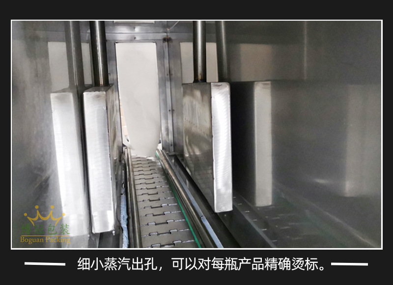 蒸汽式熱收縮機可以根據不同的生產速度來調節設備功率的大小,輸送帶采用無級調速,輸送速度可以任意調節。廣泛應用于大桶或小瓶裝礦泉水、純凈水;汽水和茶飲料等食品飲料行業,以及化妝品、洗發水和五金電子等需要收縮膜包裝的場合使用