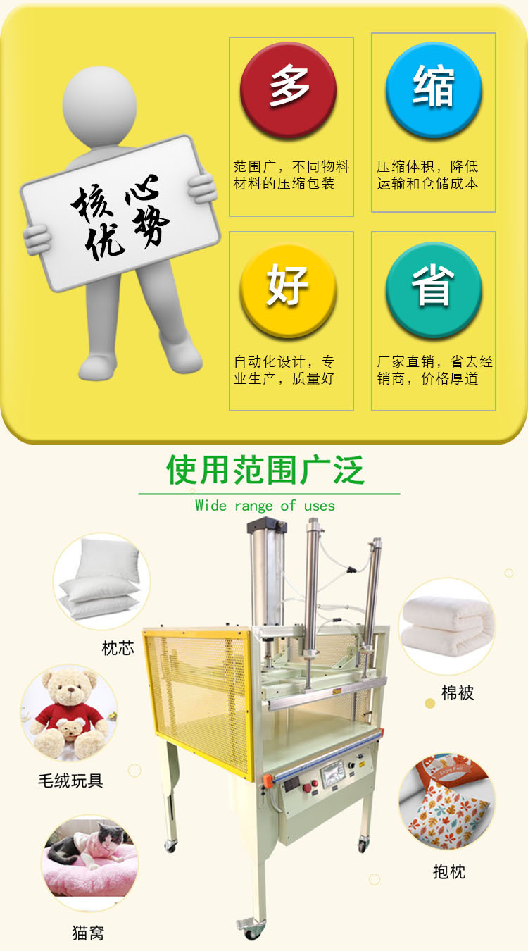 壓縮包裝封口機適用于壓縮包裝羽絨被服、太空棉被服、枕頭、發泡棉、毛巾等蓬松的其它物品??煽s小包裝的物品及防潮防塵